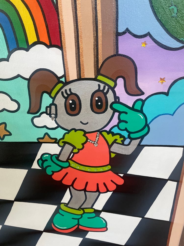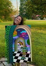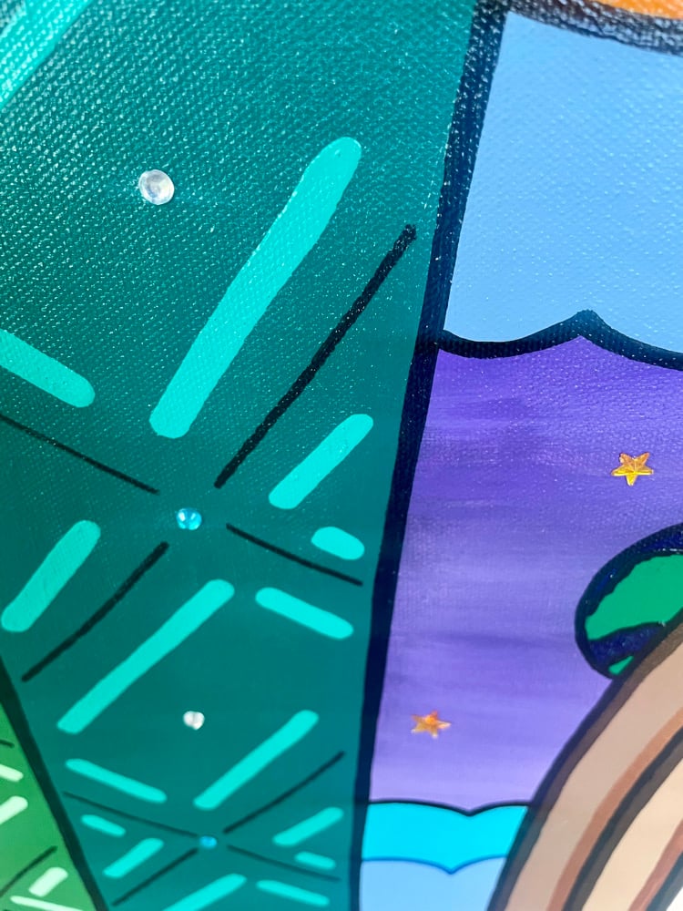 36inx24in stretched canvas painted with acrylic paint and sealed with a clear gloss.