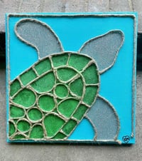 14inx14in stretched canvas painted with acrylic paint, twine and glitter.